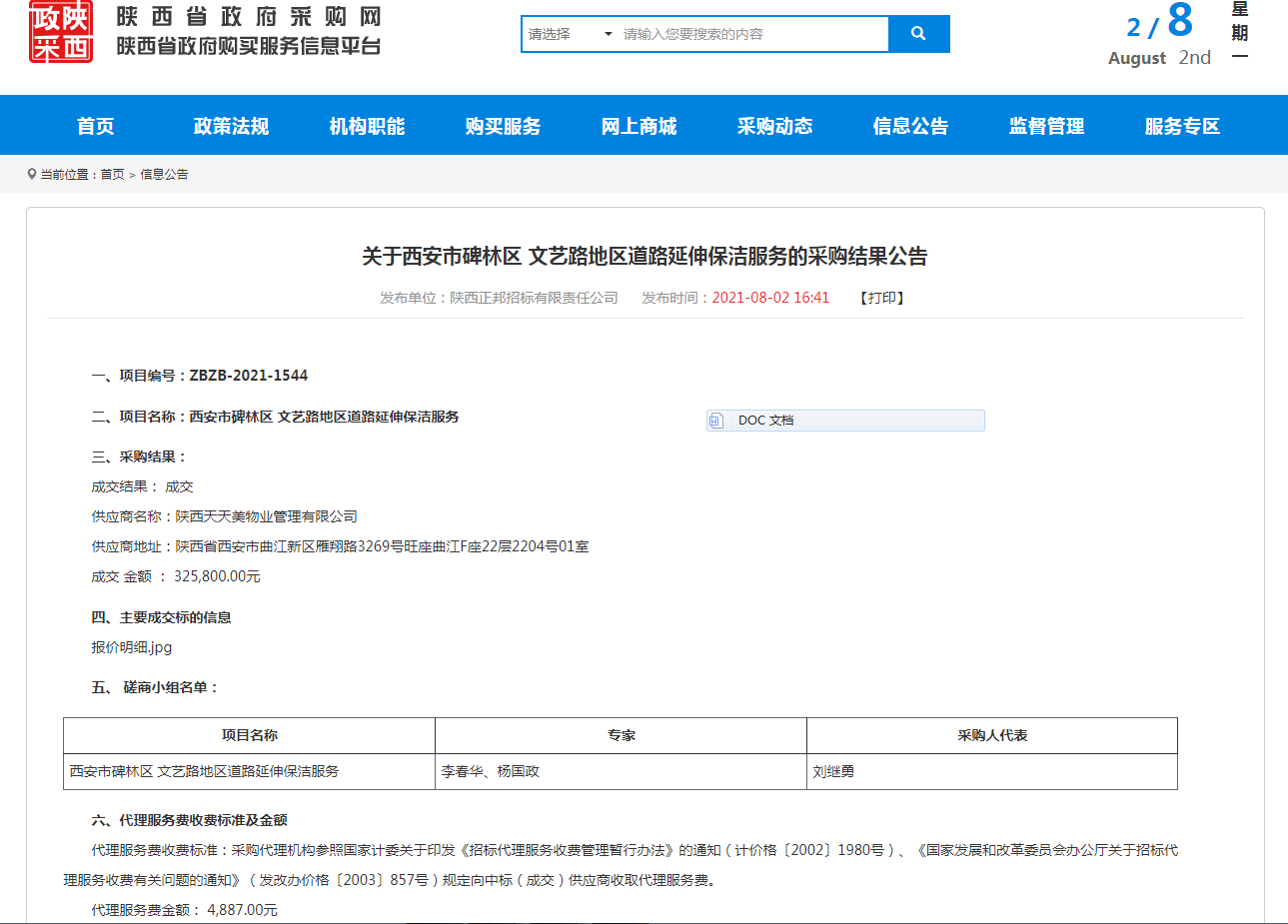 關(guān)于西安市碑林區(qū) 文藝路地區(qū)道路延伸保潔服務(wù)的采購結(jié)果公告