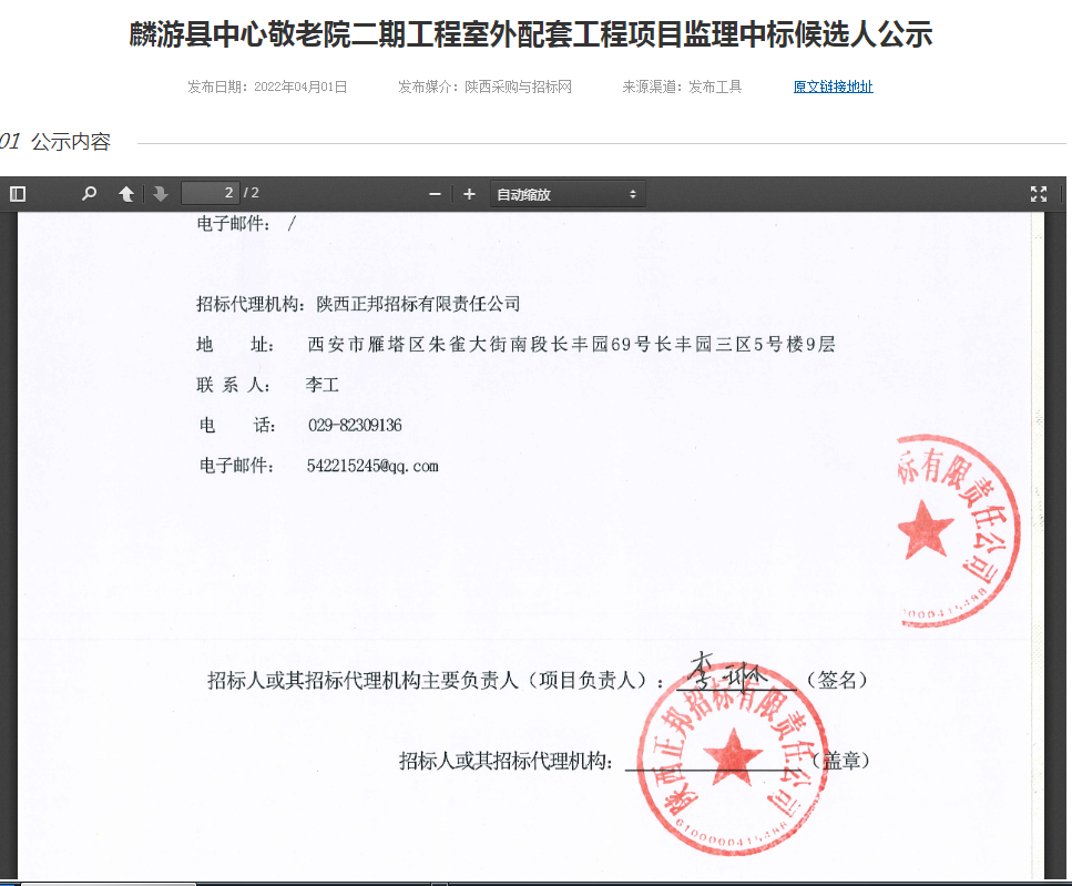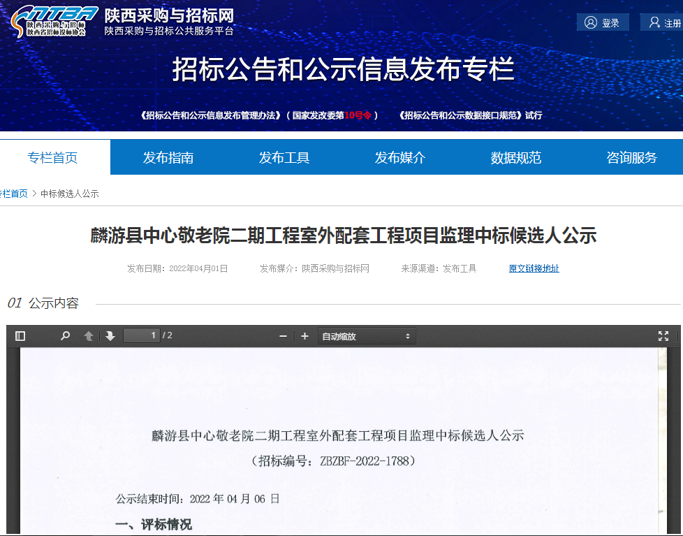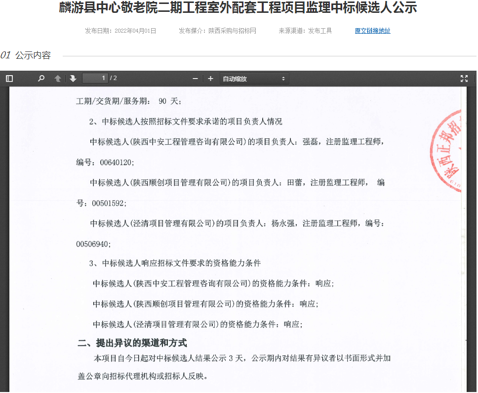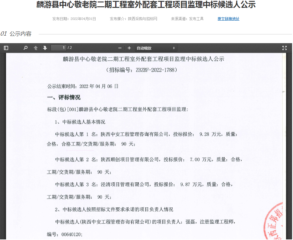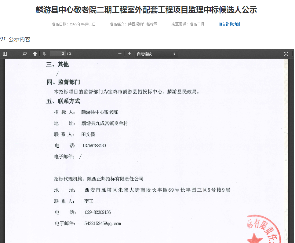 麟游縣中心敬老院二期工程室外配套工程項目監(jiān)理中標(biāo)候選人公示